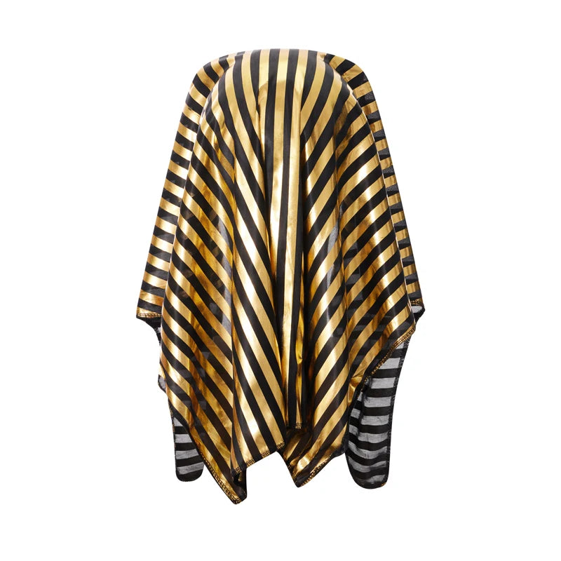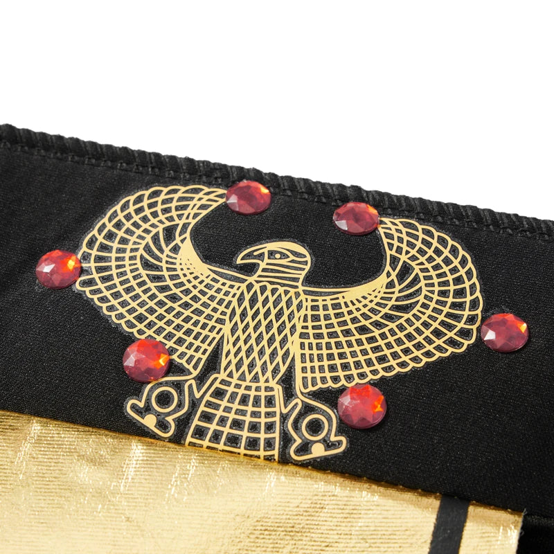 👑 Visual faraônico completo: toucado nemes, manto/capa e detalhes preto-dourado.